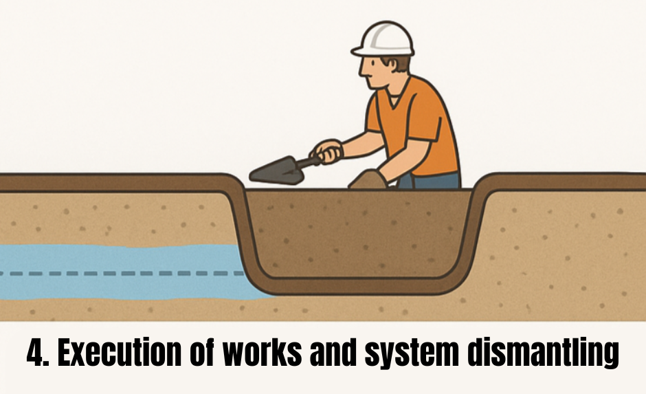 We start continuous water extraction, gradually lowering the groundwater level to the required depth. Throughout the process, water levels are constantly monitored and adjusted to ensure a stable and safe working environment at all times.